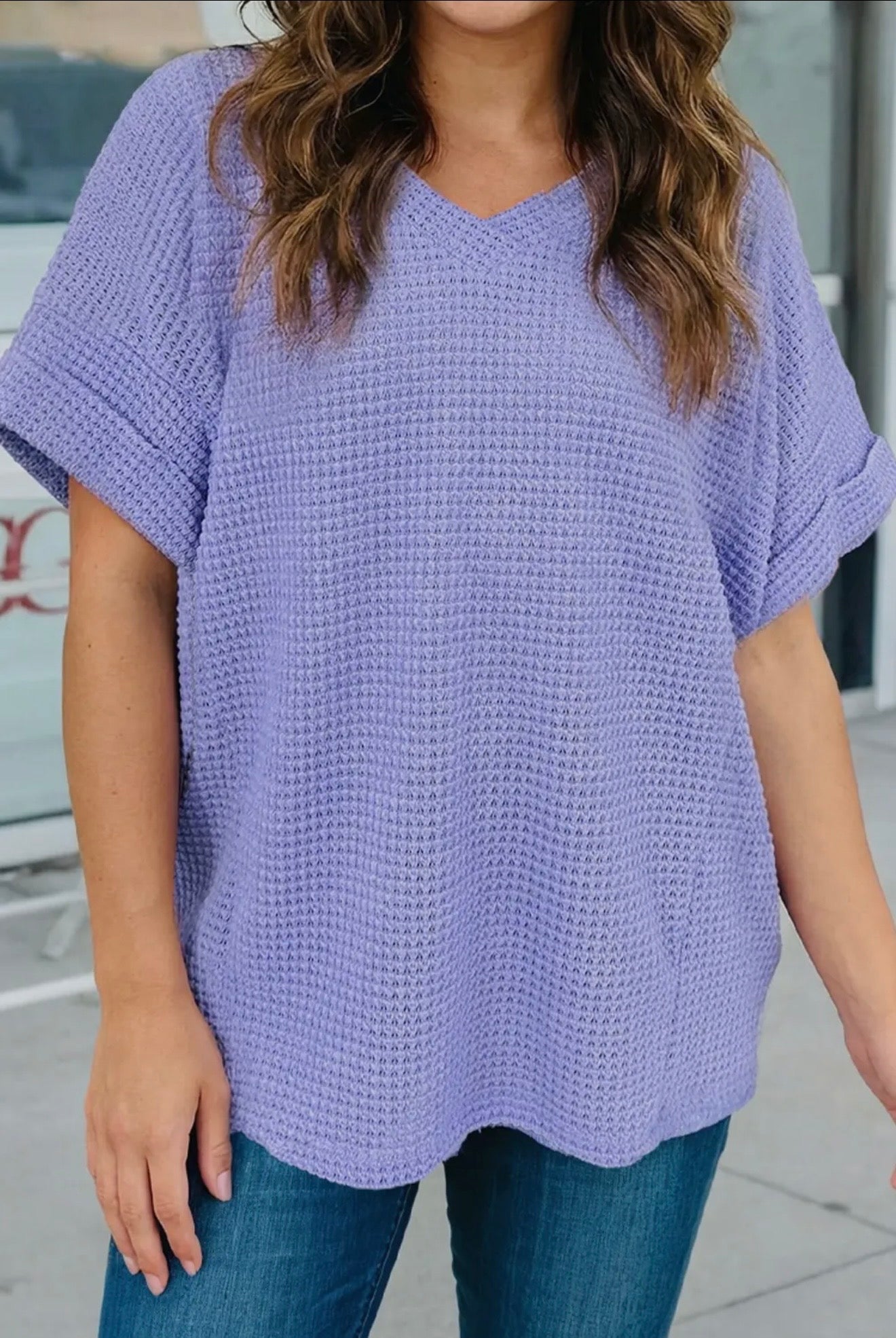- Waffle knit texture adds subtle detail and a cozy feel to this top.